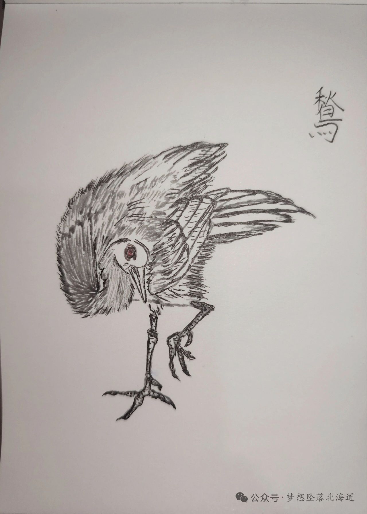 其狀如鶴而大,青蒼色,張翼廣五六尺,舉頭高六七尺,長頸赤目,頭項皆無毛,其頂皮方二寸許,紅色如鶴頂。