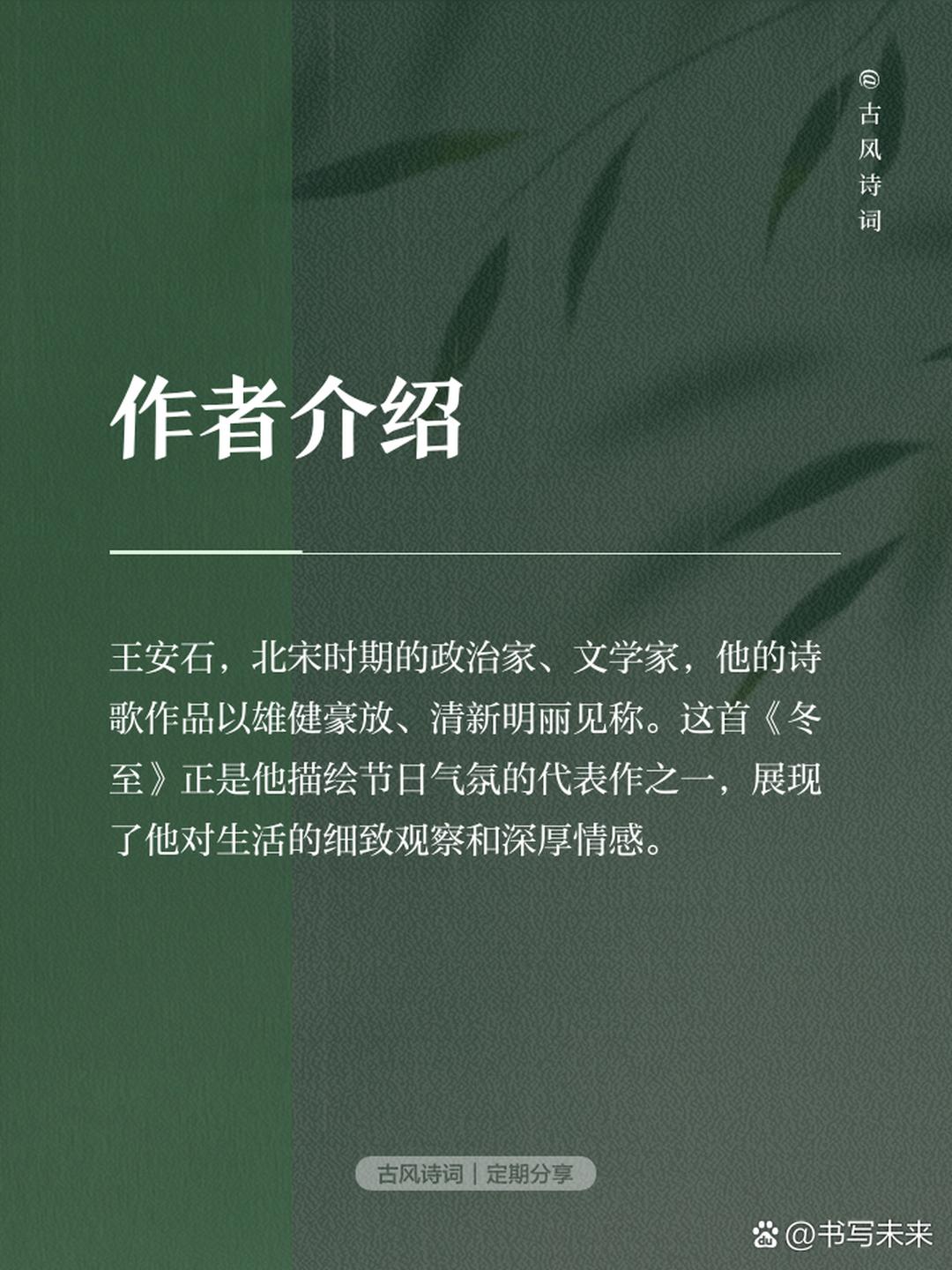 這首詩宛如寒夜中的一盞孤燈,光雖微茫,卻同時照亮了兩個世界:一個是承載著世俗溫情與家族責任的人間,另一個是充滿著政治理想與哲學思索的超然之境。正是這雙重境界的交融,讓《冬至》超越了簡單的節令詠嘆,成為一首映照出這位復雜巨人內心世界的、凝重而深邃的精神史詩。