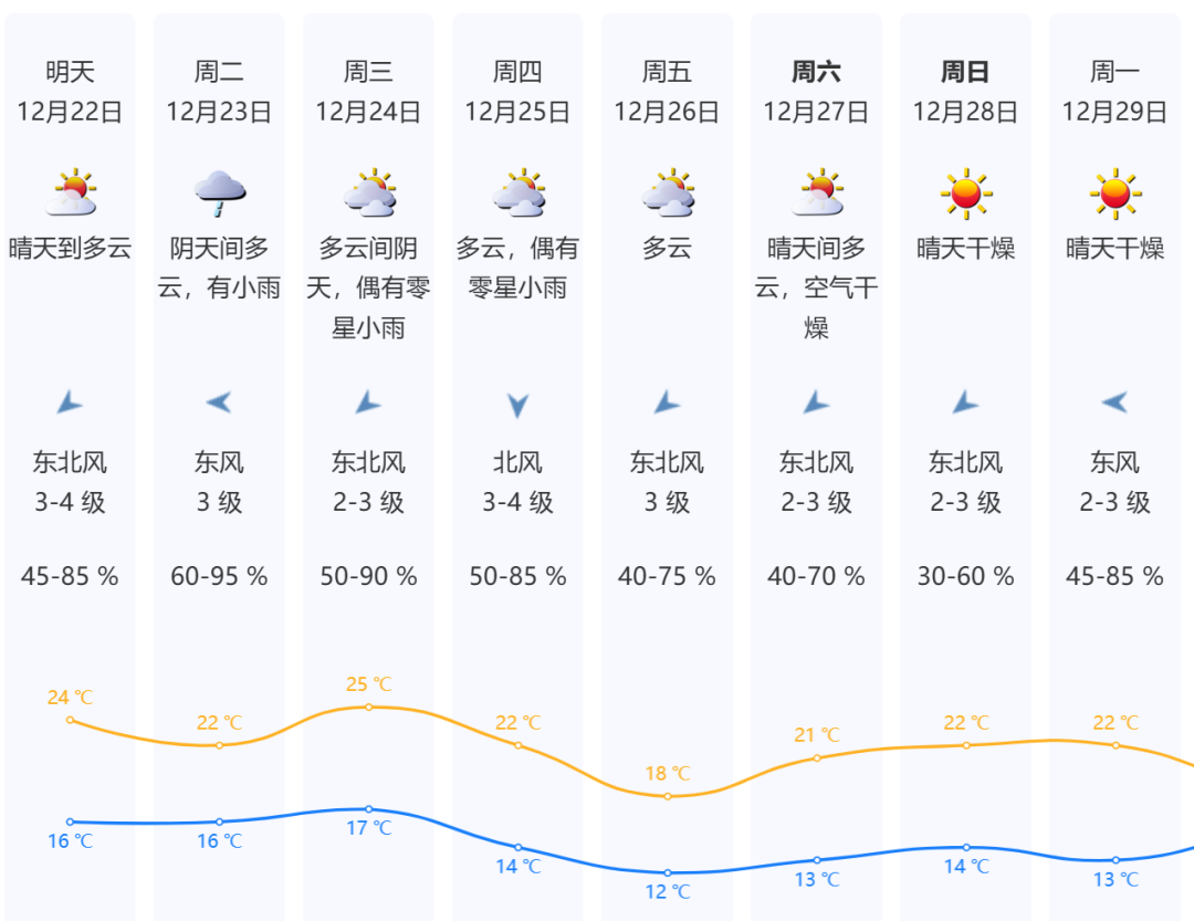 ?周一(22日)晴天到多云,氣溫16-24℃,沿海、高地和海區最大陣風7級左右;