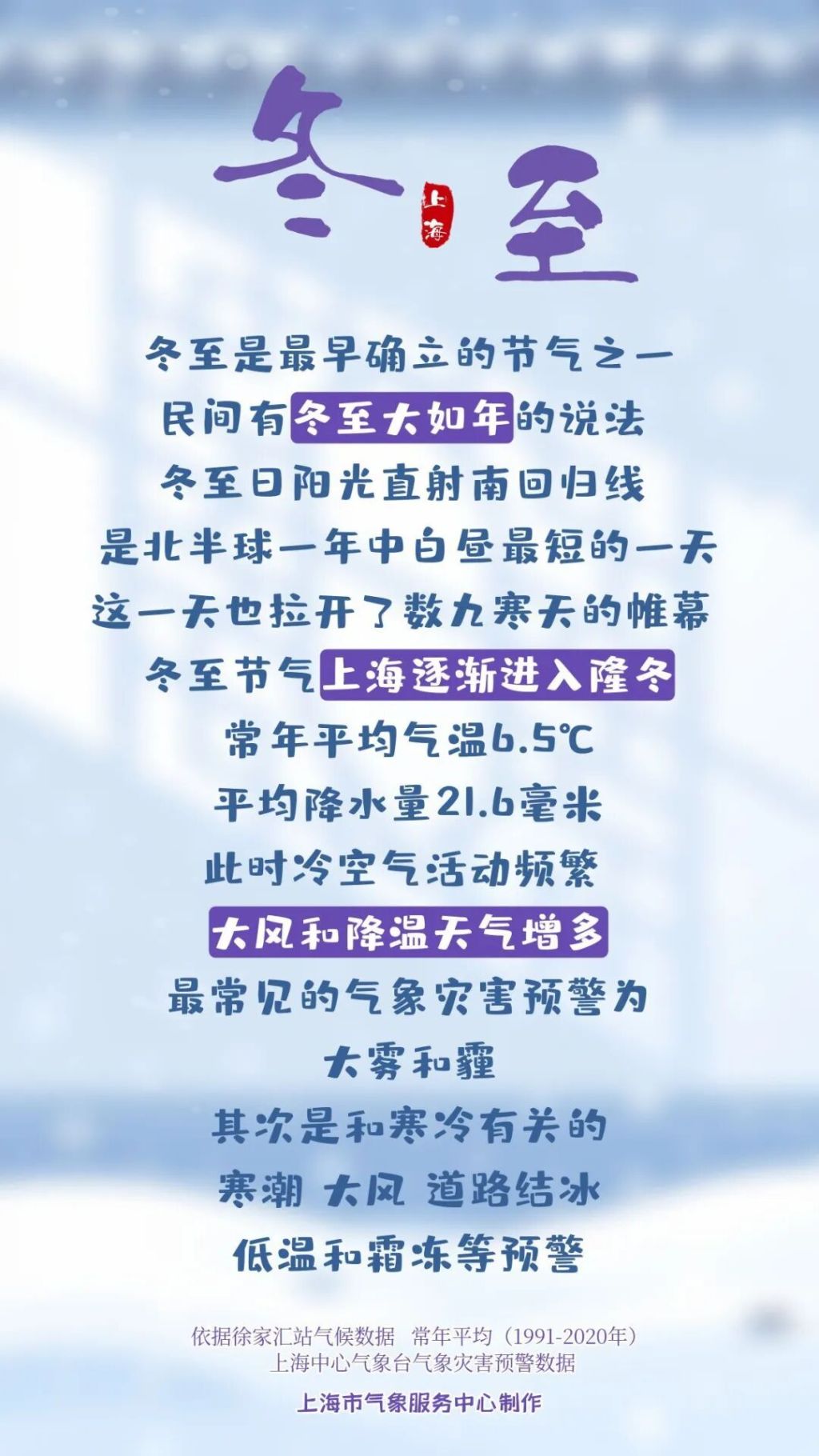 上海市氣象服務(wù)中心介紹,冬至,上海通常已進(jìn)入隆冬,冷空氣活動頻繁,大風(fēng)和降溫天氣增多,常年平均氣溫6.5℃,發(fā)布最多的是大霧預(yù)警。