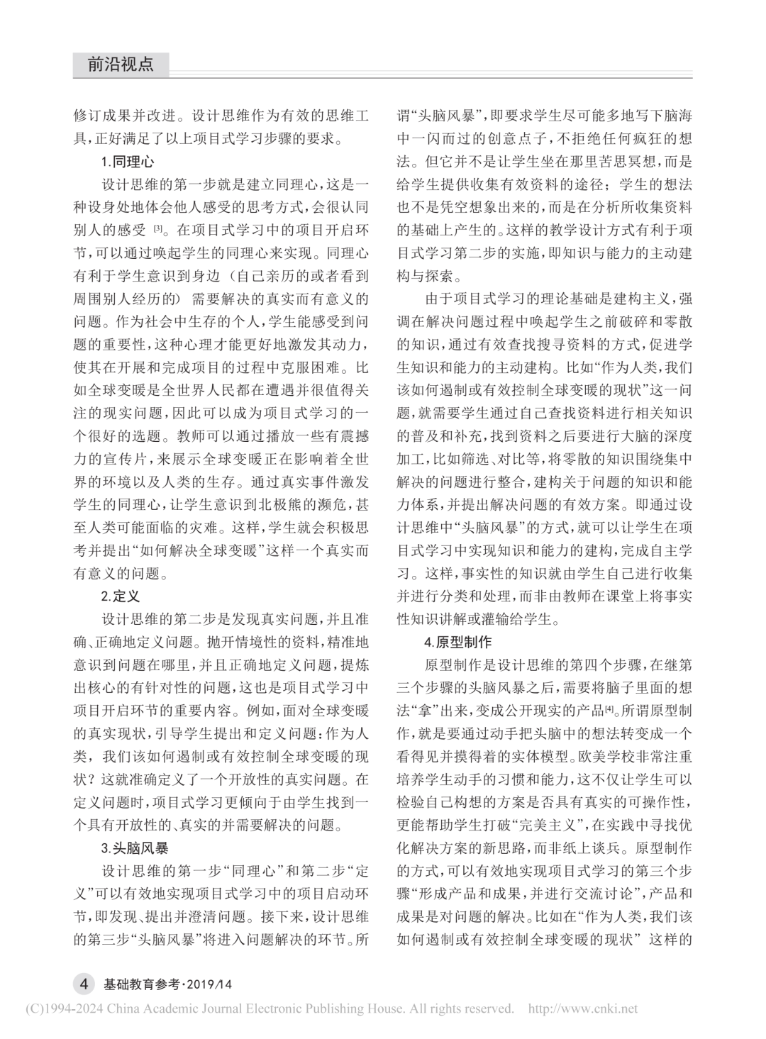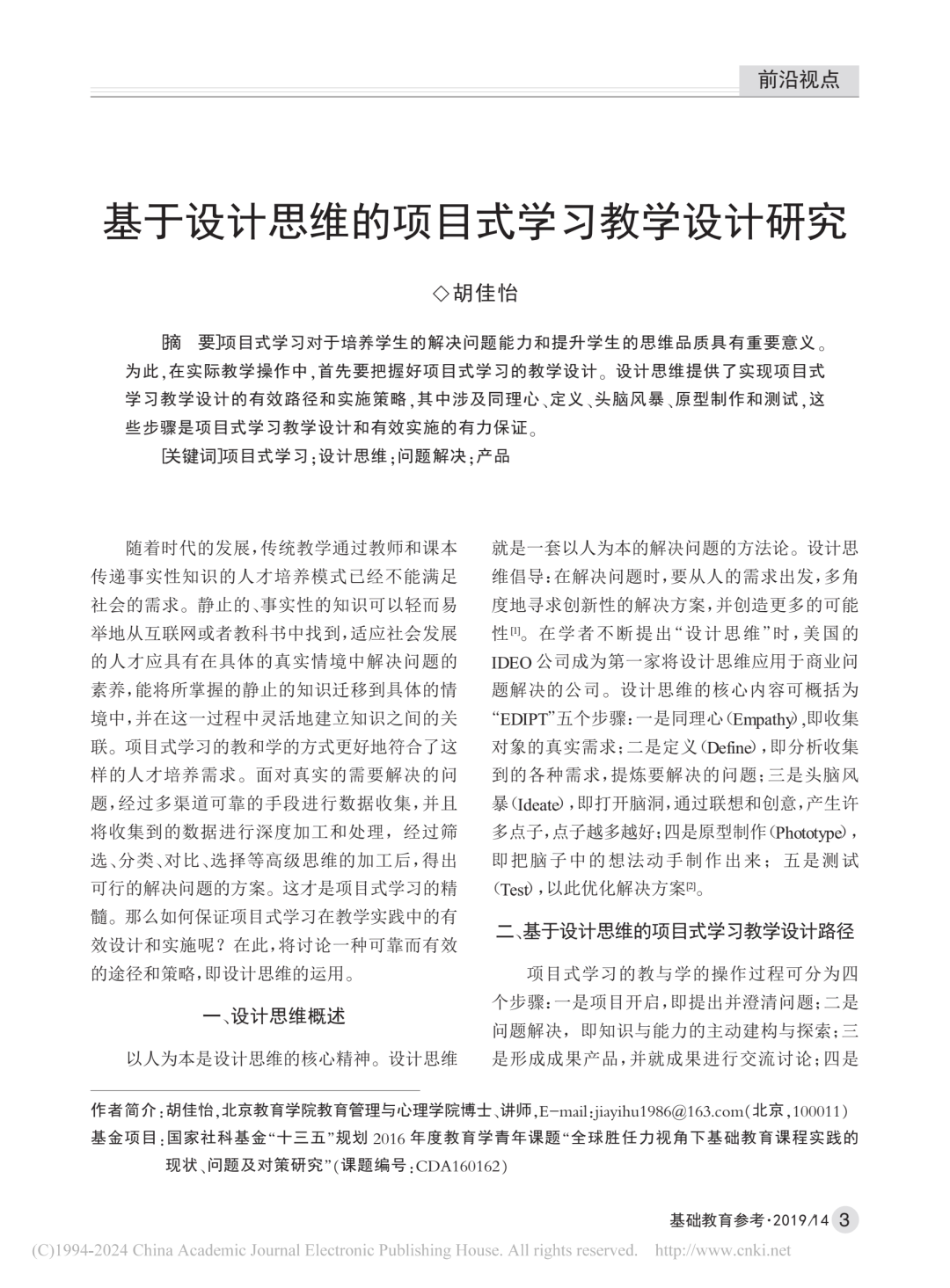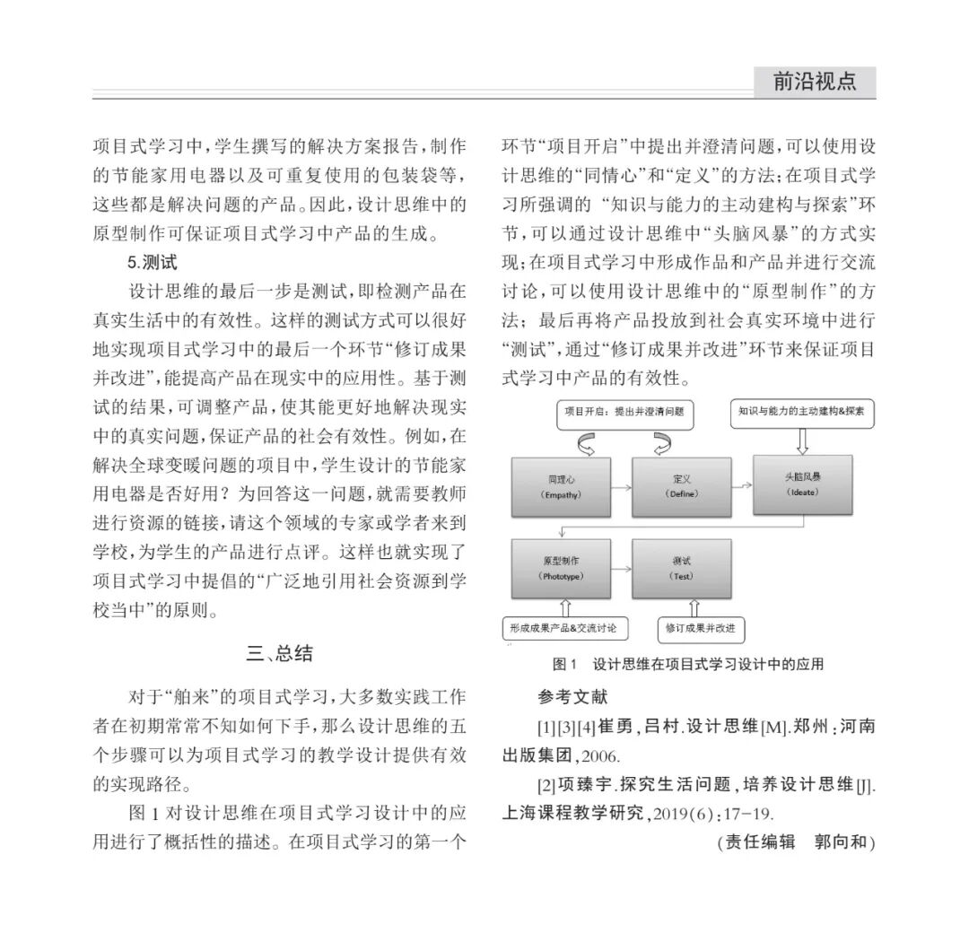 【引用格式】胡佳怡.基于設(shè)計思維的項目式學(xué)習(xí)教學(xué)設(shè)計研究[J].基礎(chǔ)教育參考,2019(14):3-5.