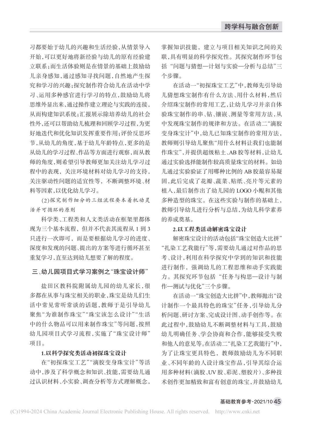 幼兒園的課程和教學方式不同于中小學。為了建構屬于幼兒園的項目式學習實踐路徑,研究者在“3SE”課程模式的基礎上,開發了幼兒園項目式學習框架,并通過“珠寶設計師”案例,檢驗框架合理性,總結了幼兒園項目式學習的課程模式及開展活動的思路與要求,為幼兒園的教育實踐提供參考和借鑒。