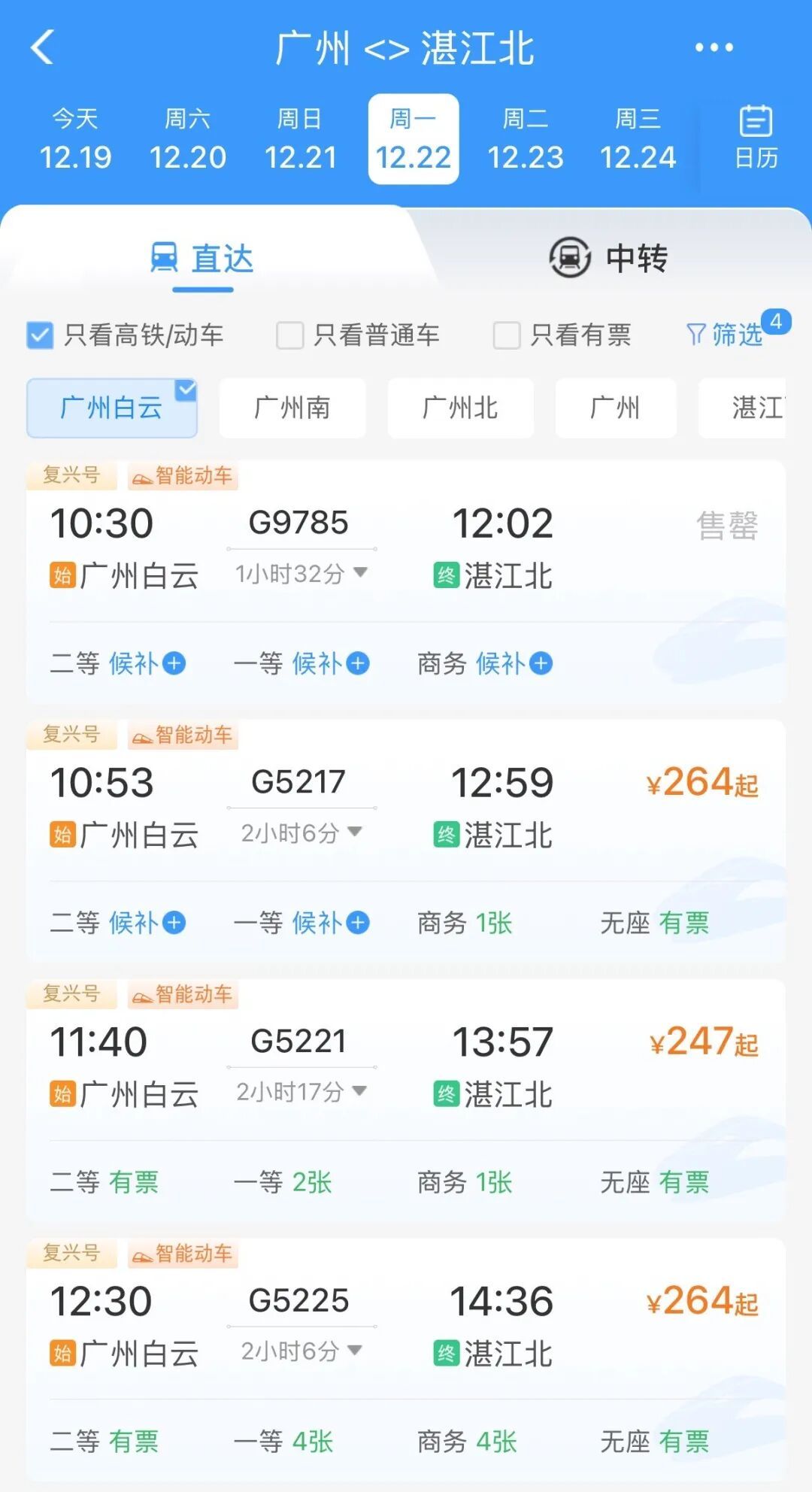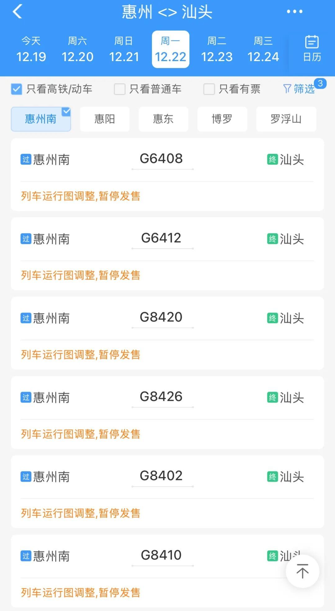 12月22日汕頭南到汕頭高鐵運營班次已全部錄入12306售票系統(tǒng),票價和具體運行時間尚未公布,從惠州出發(fā)的話,惠州南站有班次,十分便利。