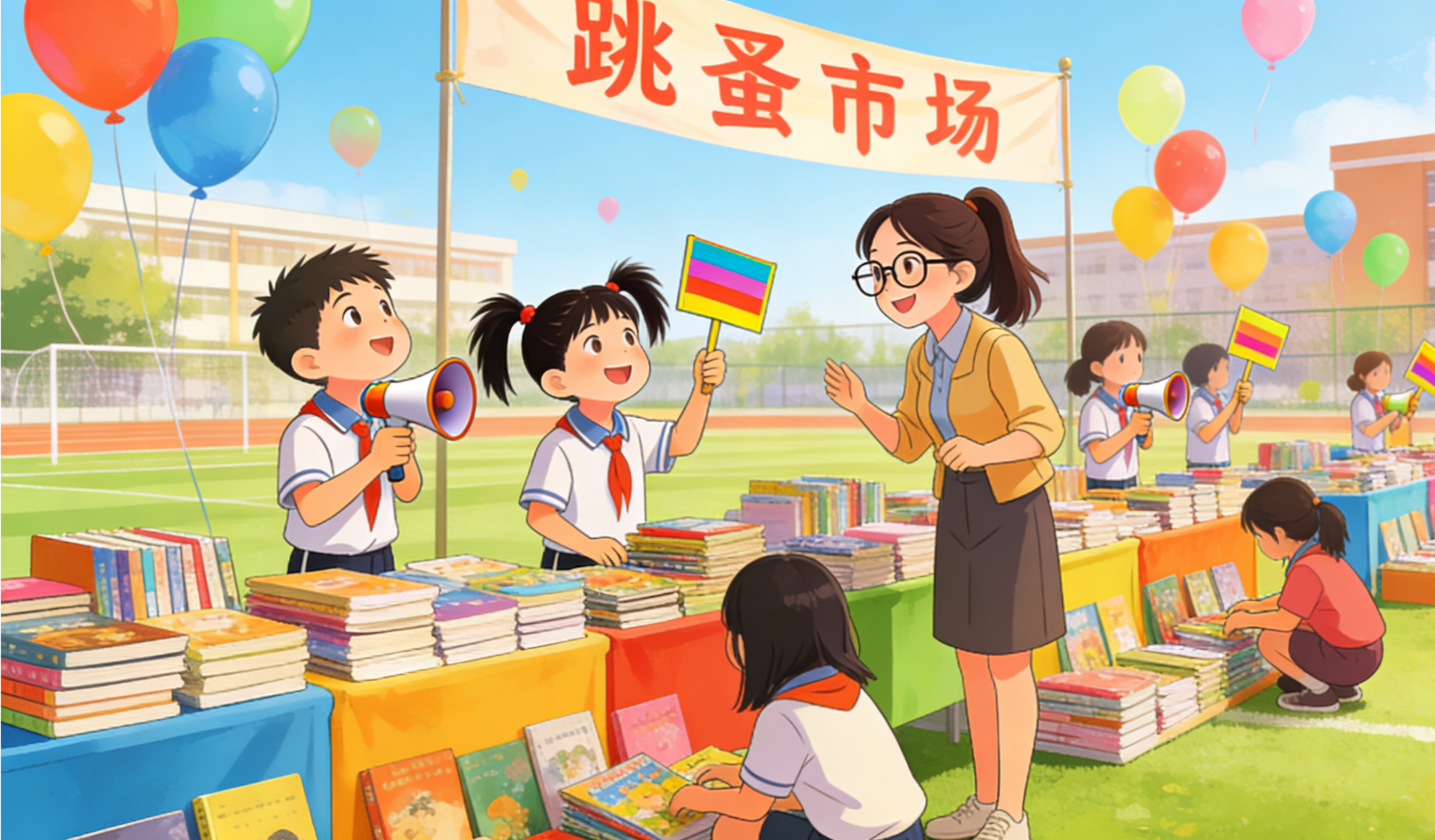 一年一度的圖書節拉開了帷幕,新教學樓前瞬間變成了一片歡騰的“書海”。叫賣聲、討價還價聲此起彼伏,同學們穿梭在各個攤位之間,有的賣力吆喝推銷書籍,有的蹲在攤位前認真挑選心儀的讀物。