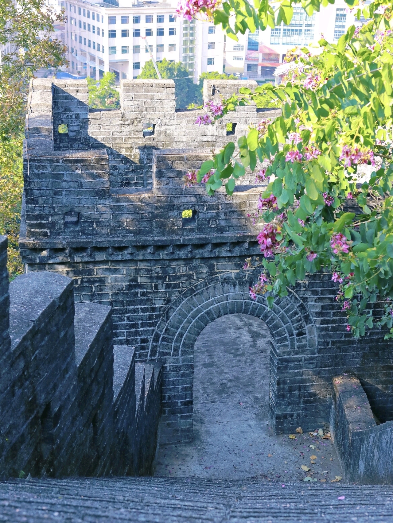 作為南灣街道的標志性公園,求水山藏著太多驚喜。380米長的仿古長城沿山而建,烽火臺、垛口、青石板階梯一應俱全,站在城墻之上,腳下是南灣的煙火街景,遠處是錯落的城市建筑,瞬間解鎖“南灣之窗”絕佳視野。