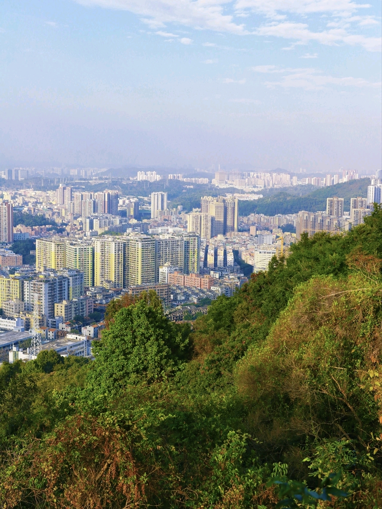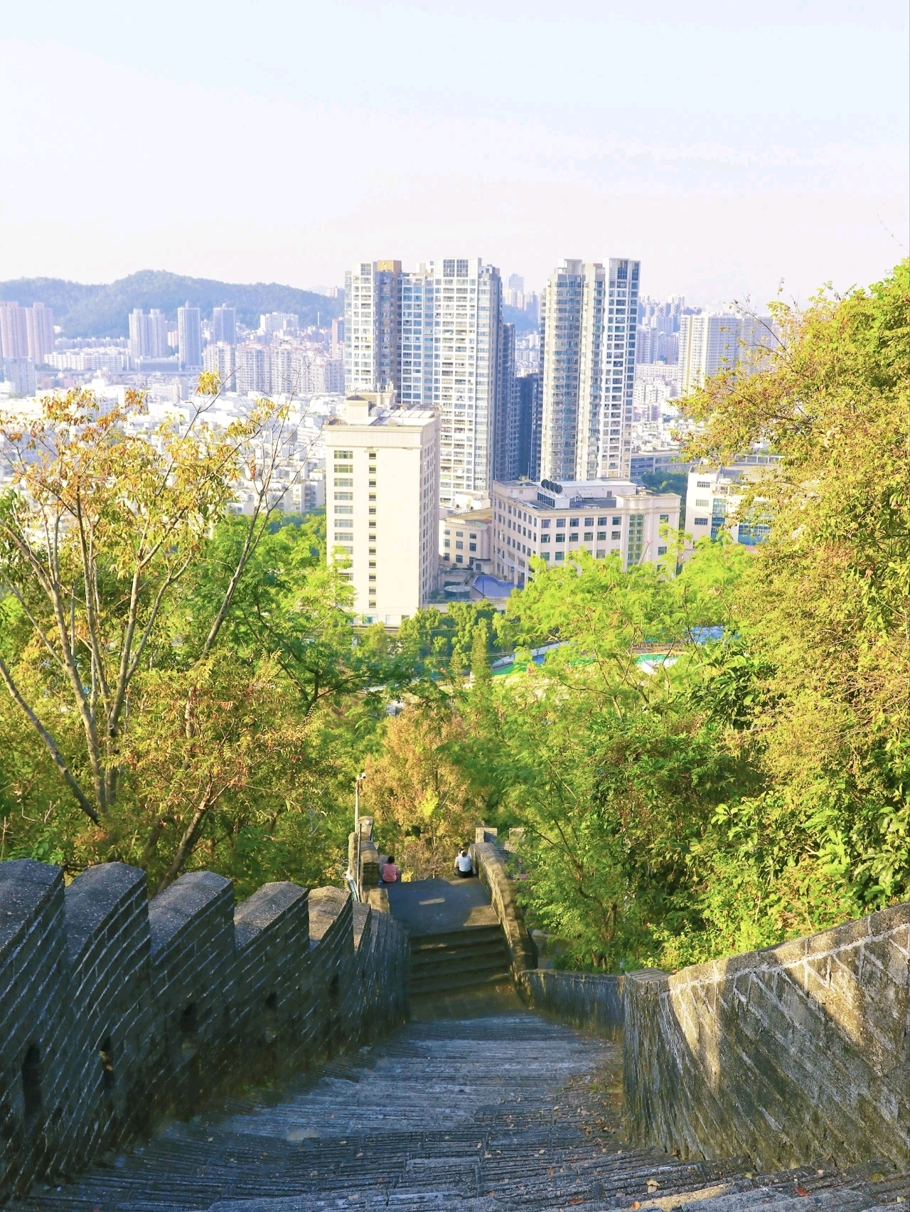 爬完小長城,往上走到山頂廣場,眼前會豁然開朗。深圳水庫的粼粼波光、梧桐山的層巒疊翠,再加上弘法寺的飛檐翹角,山水相映的畫面,讓人一下子聯想到 “千島湖” 的詩意景致。這里強烈建議拍一段視頻,鏡頭緩緩從肩膀往前推,掃過山水城林,畫面超帶感。