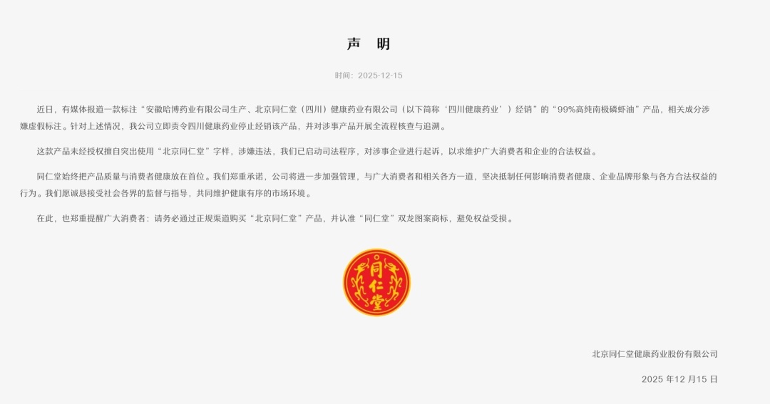 12月15日,北京同仁堂健康藥業股份有限公司就此事發布聲明。同仁堂健康稱,公司立即責令四川健康藥業停止經銷該產品,并對涉事產品開展全流程核查與追溯。
