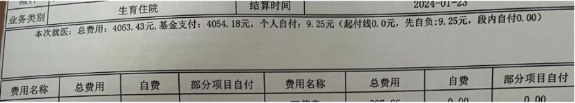 生育住院賬單截圖。