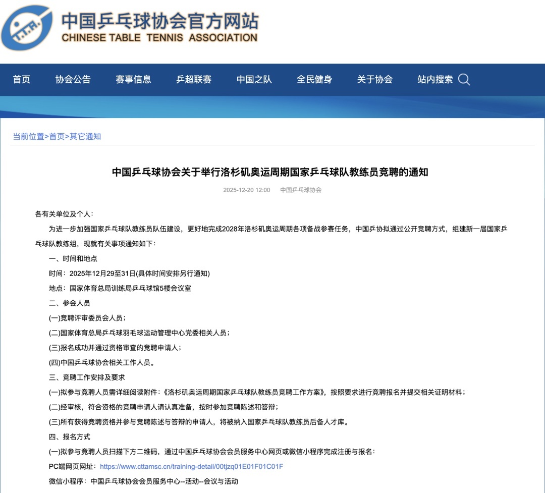 12月20日,中國(guó)乒乓球協(xié)會(huì)在官網(wǎng)發(fā)布《中國(guó)乒乓球協(xié)會(huì)關(guān)于舉行洛杉磯奧運(yùn)周期國(guó)家乒乓球隊(duì)教練員競(jìng)聘的通知》,正式啟動(dòng)新周期國(guó)家隊(duì)教練員公開(kāi)競(jìng)聘工作,完成洛杉磯奧運(yùn)周期備戰(zhàn)任務(wù)。