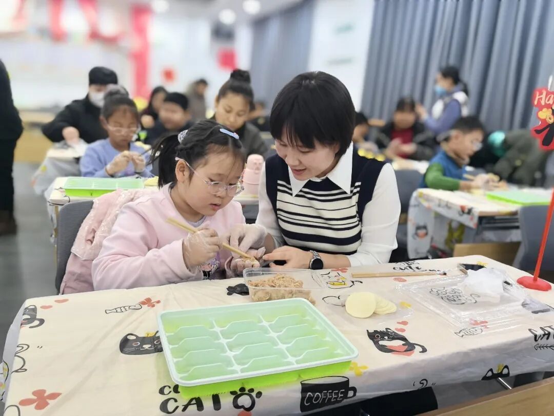 最令人期待的包餃子環節將整個活動推向高潮。家長和孩子圍坐在一起,共同動手包餃子——大人握著孩子的小手,耐心教他們放餡、捏邊;孩子們認真學著,時而抬頭甜甜一笑。雖然包出的餃子形狀各異,但每個都包裹著親子間的愛與歡笑。