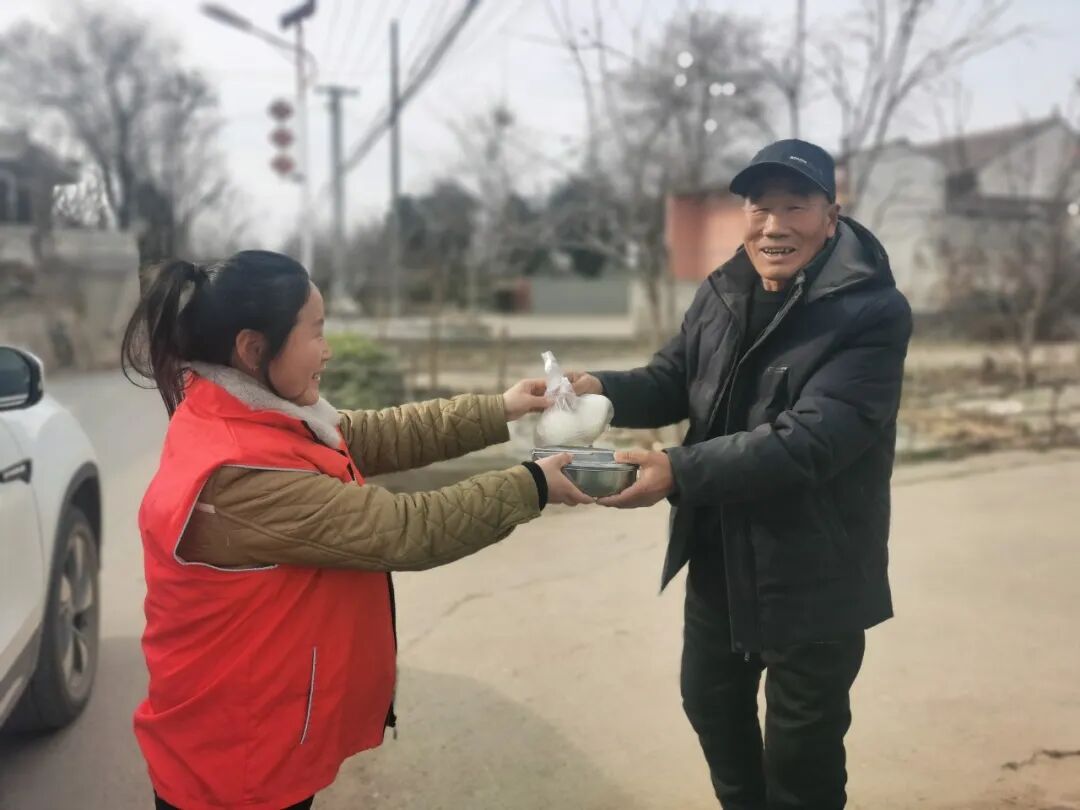 經過一上午的努力,煮熟的餃子整齊碼放在餐盒中。隨后,志愿者們分組行動,將餃子逐一送到村中孤寡老人、高齡獨居老人和殘疾人員的家中。“張爺爺,這是我們包的餃子,趁熱吃!”在74歲的張解放老人家門口,柳婷婷將餃子送到老人手中。張解放捧著熱氣騰騰的餃子說道:“年紀大了,行動不便,沒想到還有人記得我們的小日子。”