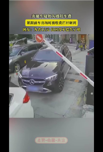 奔馳車疑似為逃停車費,緊跟前車出場時被收費攔桿砸到