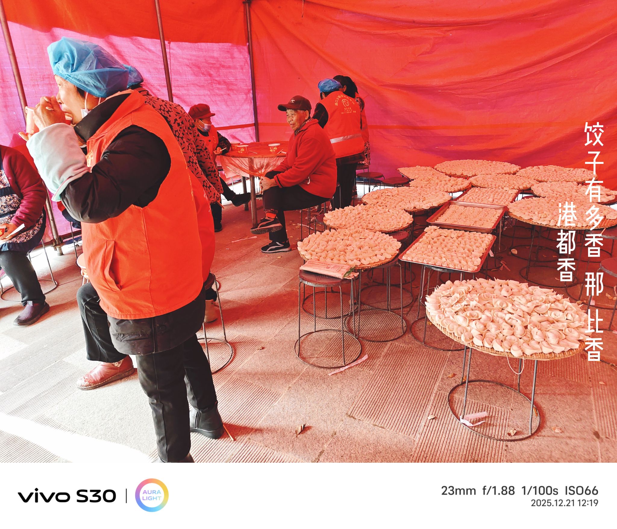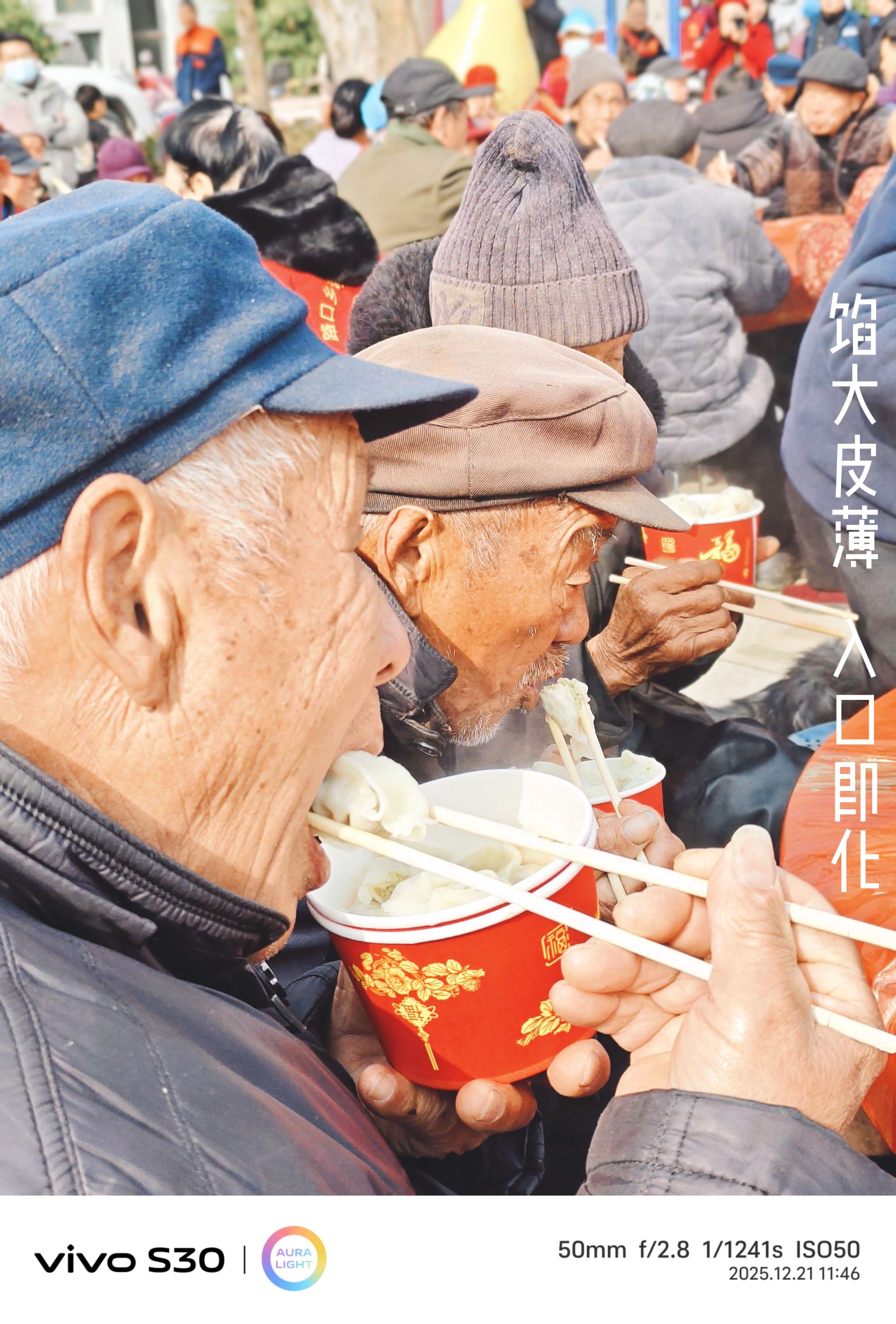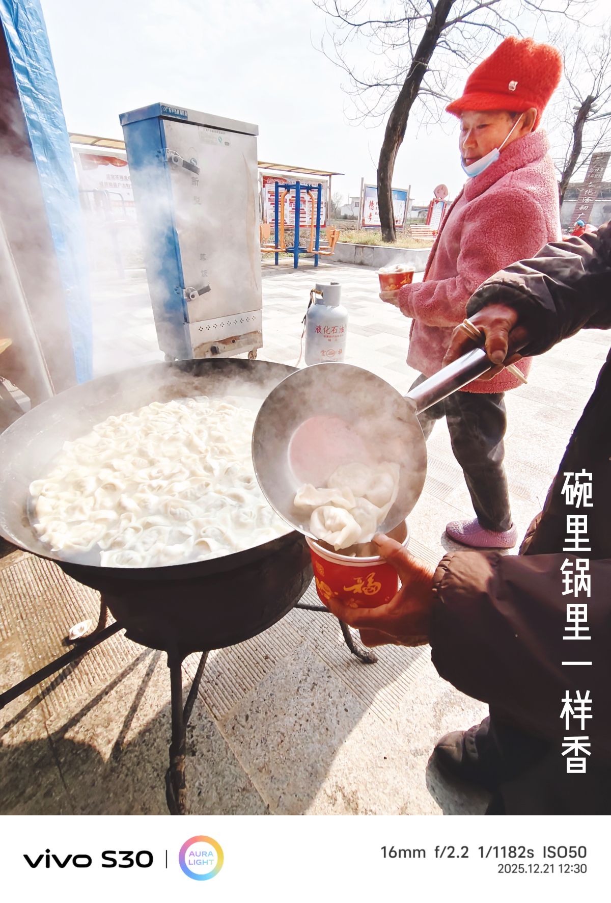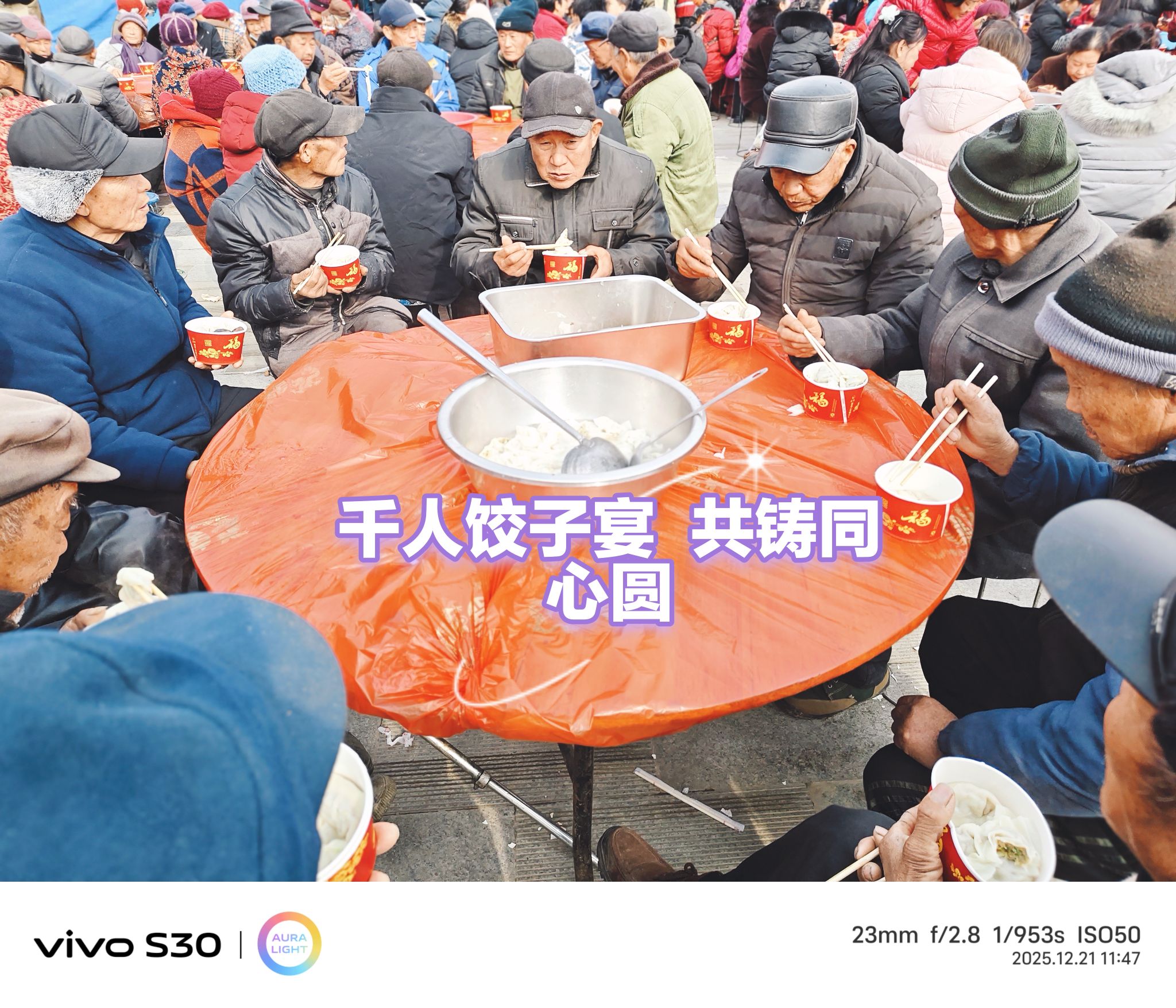 熱鬧如過年的彎柳樹廣場,來自有關方面的領導們,紛紛脫下冬日的厚裝,為受邀參加餃子宴的父老鄉親們,端來一盆又一盆、盛起一碗又一碗,冒著尖、飄著濃濃熱氣的噴香餃子。