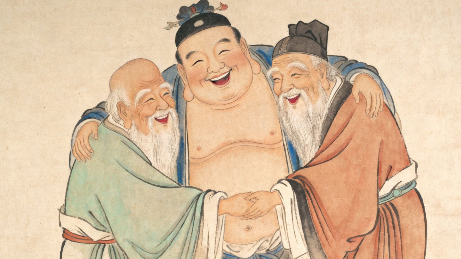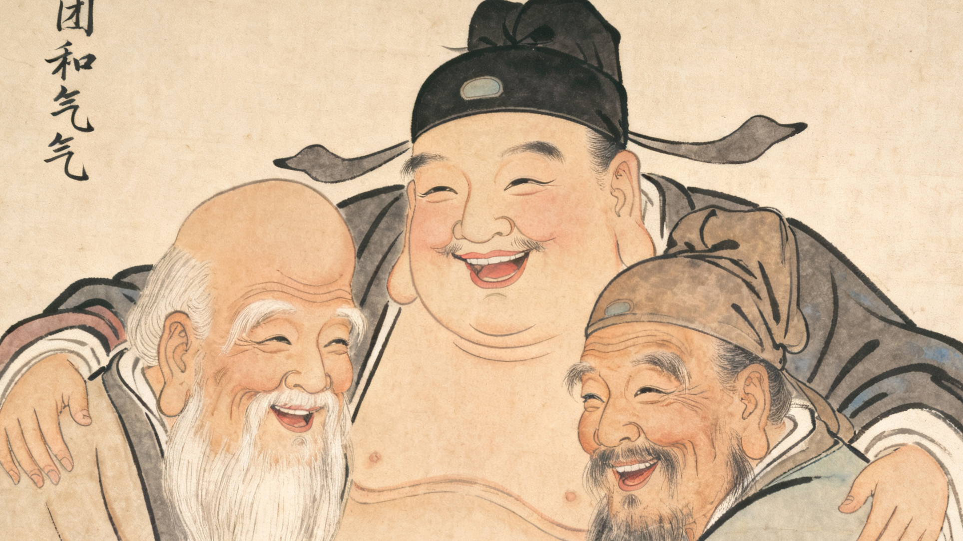 然而,當(dāng)我們仔細(xì)觀察這幅畫時,就會發(fā)現(xiàn)其中的精妙之處。原來,這看似一個人的形象,實則是由三個人相擁而成。畫面右側(cè)頭戴道冠的是道教仙人,左側(cè)結(jié)發(fā)的則是佛教高僧,而中間的胖和尚則將二者融合在一起。三人的臉相互依偎,身體緊密相連,構(gòu)成了一個和諧統(tǒng)一的整體。
