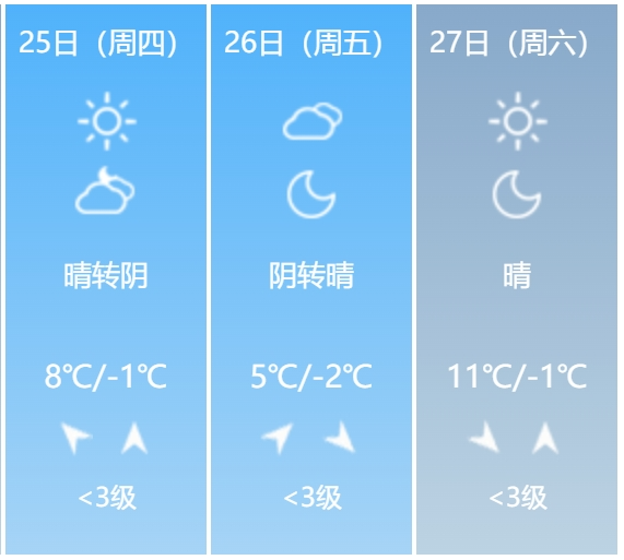 23日,多云到晴天,西北風4級到5級,陣風7級到8級,夜里減小至3級左右,氣溫-2℃—12℃。