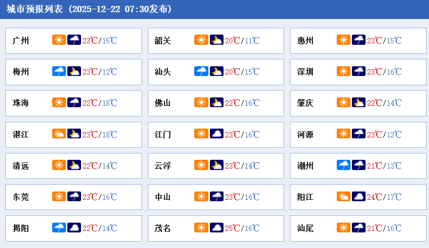 22日,我省南部市縣晴轉多云,局部有零星小雨,其余市縣多云到晴,早晨部分市縣有輕霧或霧。最低氣溫:韶關、清遠北部、河源北部、梅州北部市縣8~11℃,珠三角南部和粵西沿海市縣15~19℃,其余市縣11~15℃。