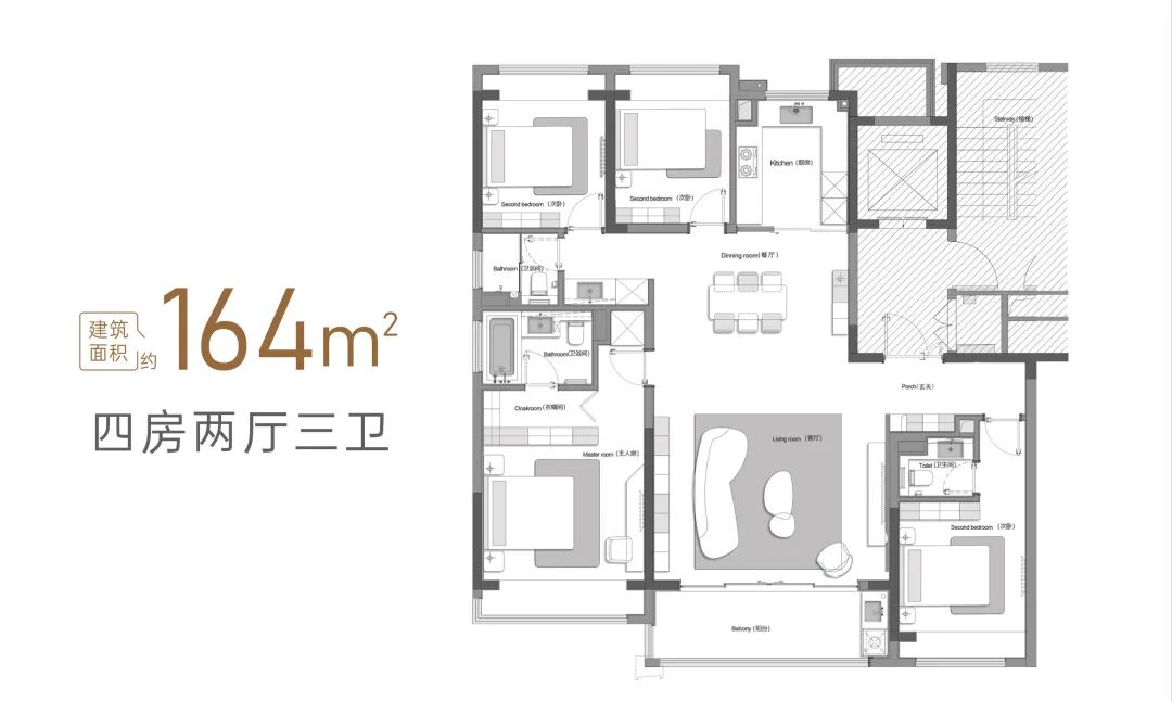 ? 瓏月(約164m2):四室兩廳三衛(wèi),方正格局,南向雙套房,全明廚房;
