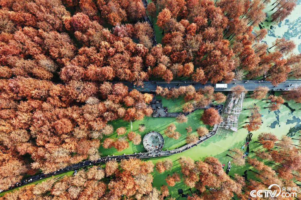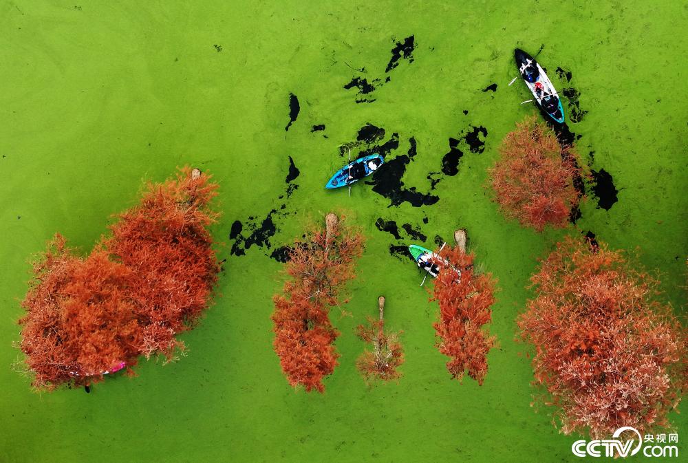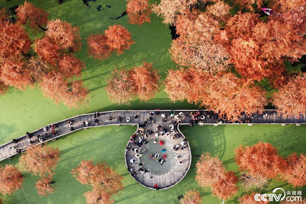 12月22日,浙江杭州,游客在青山湖水上森林公園游覽觀光。近日,杭州青山湖水上森林公園近百畝池杉、落羽杉迎來最佳觀賞期,火紅的水上森林與和水面碧綠的浮萍相映成景,如畫般的冬日美景吸引游客紛至沓來。視覺中國