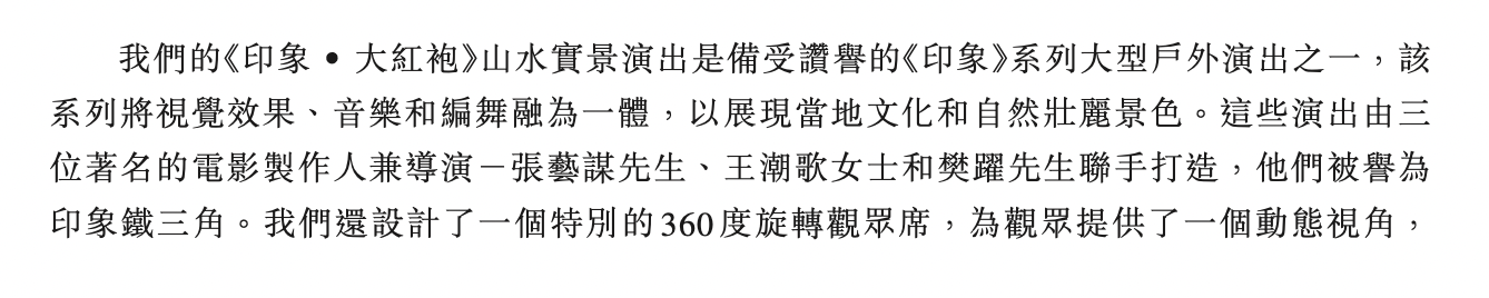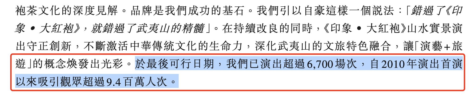 印象大紅袍的主要重點是標志性演出-《印象?大紅袍》山水實景演出。根據弗若斯特沙利文的資料,該演出為福建省首個大型戶外山水實景演出,歷來及于往績記錄期一直是公司主要收入來源。