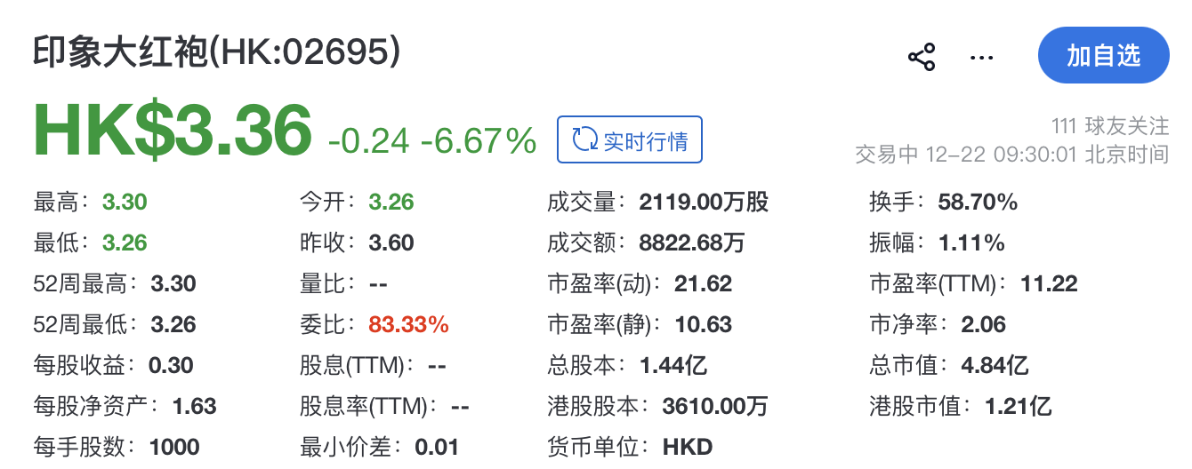 瑞財經 吳文婷 12月22日,印象大紅袍(02695.HK)在港交所掛牌上市,聯席保薦人為興證國際和鎧盛。其開盤報3.36港元,跌6.67%,總市值約4.84億港元。