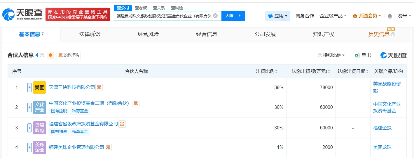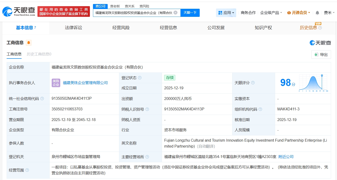天眼查App顯示,近日,福建省龍珠文旅數(shù)創(chuàng)股權投資基金合伙企業(yè)(有限合伙)成立,執(zhí)行事務合伙人為福建美珠企業(yè)管理有限公司,出資額20億人民幣,經(jīng)營范圍為以私募基金從事股權投資、投資管理、資產(chǎn)管理等活動,由美團旗下天津三快科技有限公司、中國文…