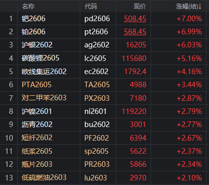 早盤(pán)收盤(pán),國(guó)內(nèi)期貨主力合約漲跌不一。廣期所鈀、鉑均封漲停板,滬銀漲超6%,碳酸鋰漲超5%,集運(yùn)指數(shù)(歐線)漲超4%,PTA漲超3%。跌幅方面,塑料、玻璃、PVC跌近2%。