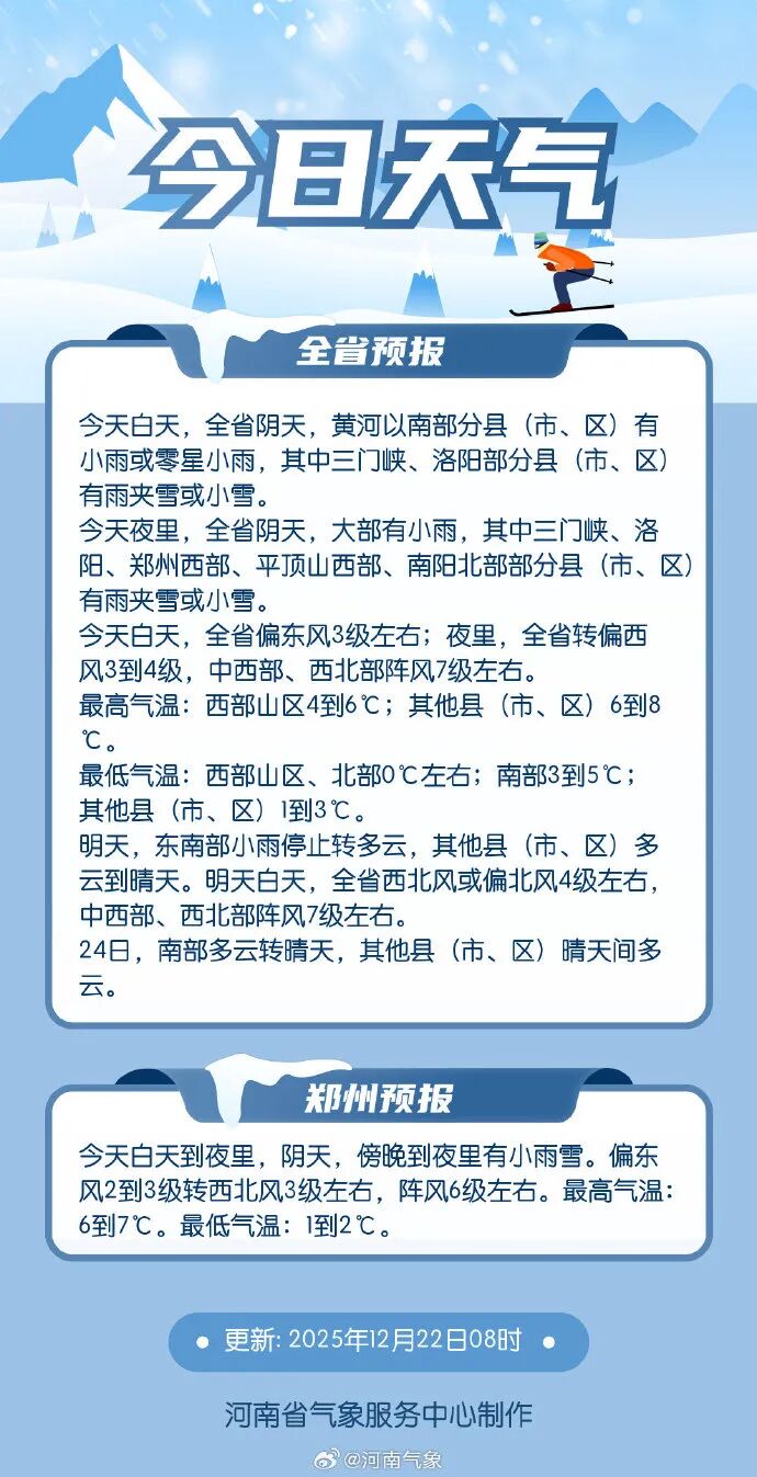 剛度過1961年以來歷史同期第二暖的大雪節氣,河南在今日(12月22日)迎來了氣溫的低點。受冷空氣和暖濕氣流共同影響,全省大部分地區最高氣溫將不足5℃,體感從前期的偏暖轉為寒冷。 今天的降水分布呈現西雪東雨的態勢。中西部、西北部部分縣市有雨夾雪或小雪,其他縣市則以小雨為主。這場雨雪對改善空氣質量有直接作用。此前受偏東風輸送影響,駐馬店等地出現的重污染霾天氣,以及南陽、光山等地的強濃霧,將隨著今日的降水自北向南逐漸消散。