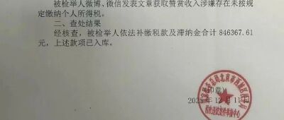 12月19日,微博用戶“急診向日葵艾芬20”(艾芬)曬出國(guó)家稅務(wù)總局北京市西城區(qū)稅務(wù)局稅收違法行為查處結(jié)果告知書,告知書顯示,艾芬舉報(bào)的網(wǎng)紅醫(yī)生寧方剛(網(wǎng)名“燒傷超人阿寶”)因自媒體贊賞收入未按規(guī)定繳稅,已補(bǔ)繳稅款及滯納金合計(jì)846367.61元。