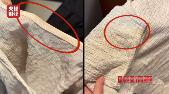 記者根據線索,從“熙熙女裝搭配”直播間僅花6元購得三件包郵的所謂“樣衣尾貨”。這些衣物乍看尚可,細看卻破綻明顯:白色上衣領口、腋下有黃漬和粉底印,黑色短裙裙擺沾有油漬,白色上衣下擺和腋下存在脫線問題,顯然都是被穿用過的二手舊衣。