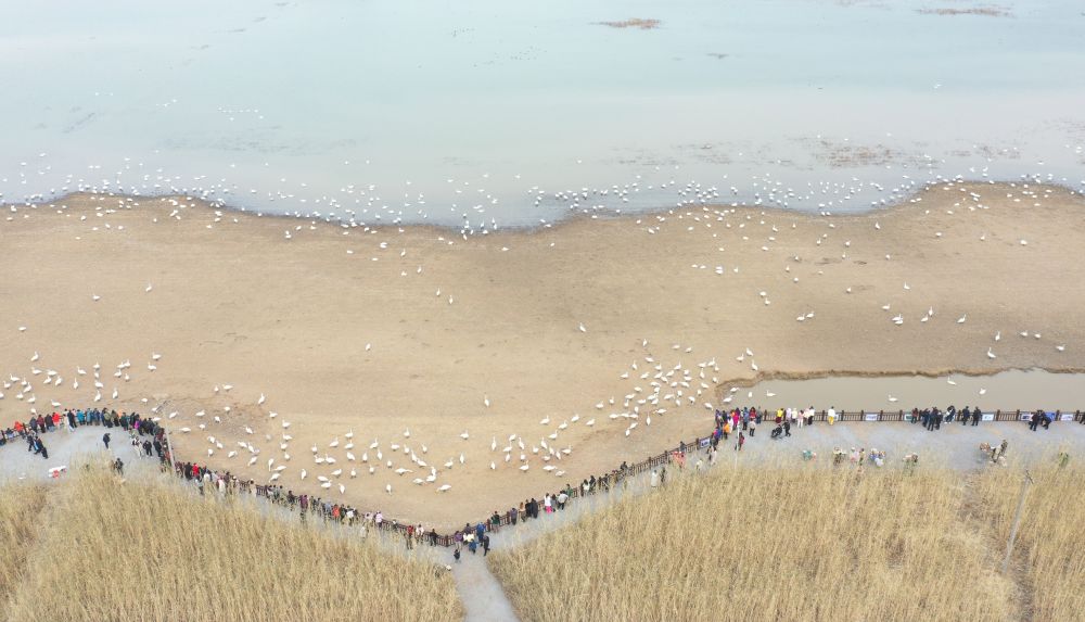 ↑12月20日,游客在河南省三門峽市黃河濕地觀賞白天鵝。新華社發(徐澤源攝)