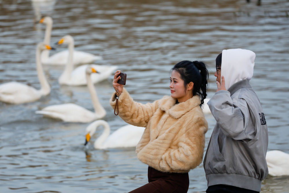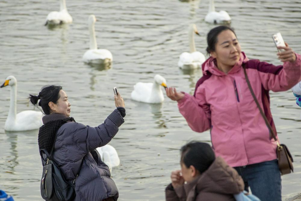 ↑12月20日,在河南省三門峽市天鵝湖國家城市濕地公園,游客與天鵝合影。新華社發(王琳鋒攝)