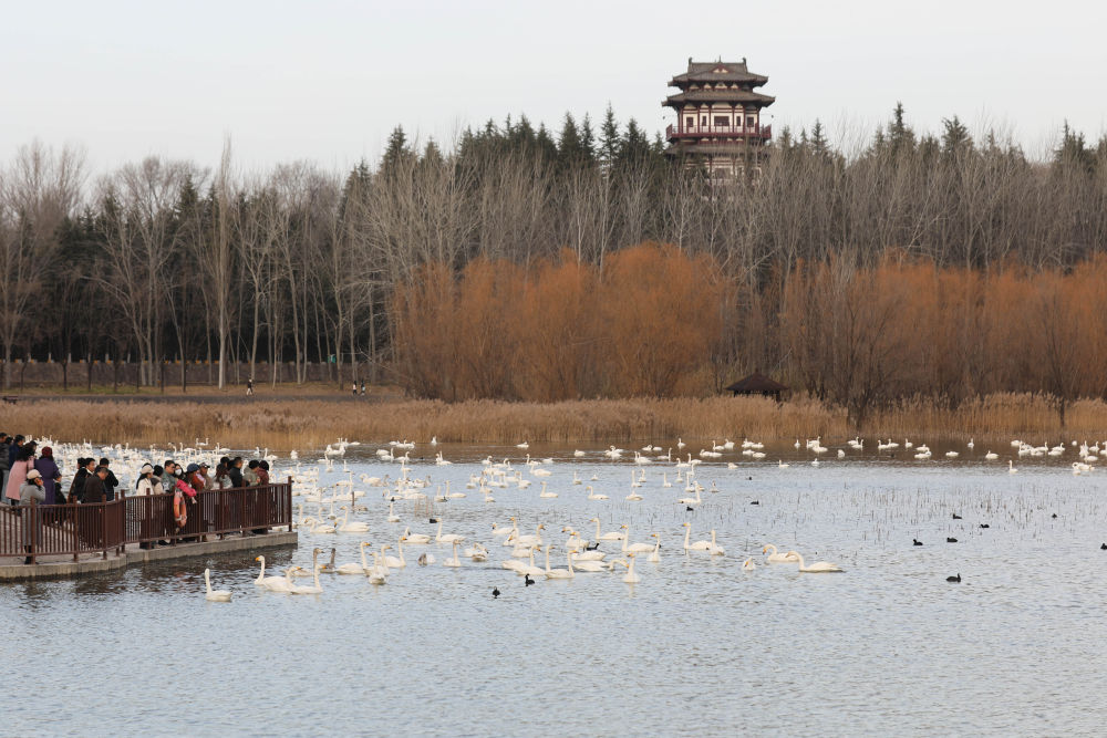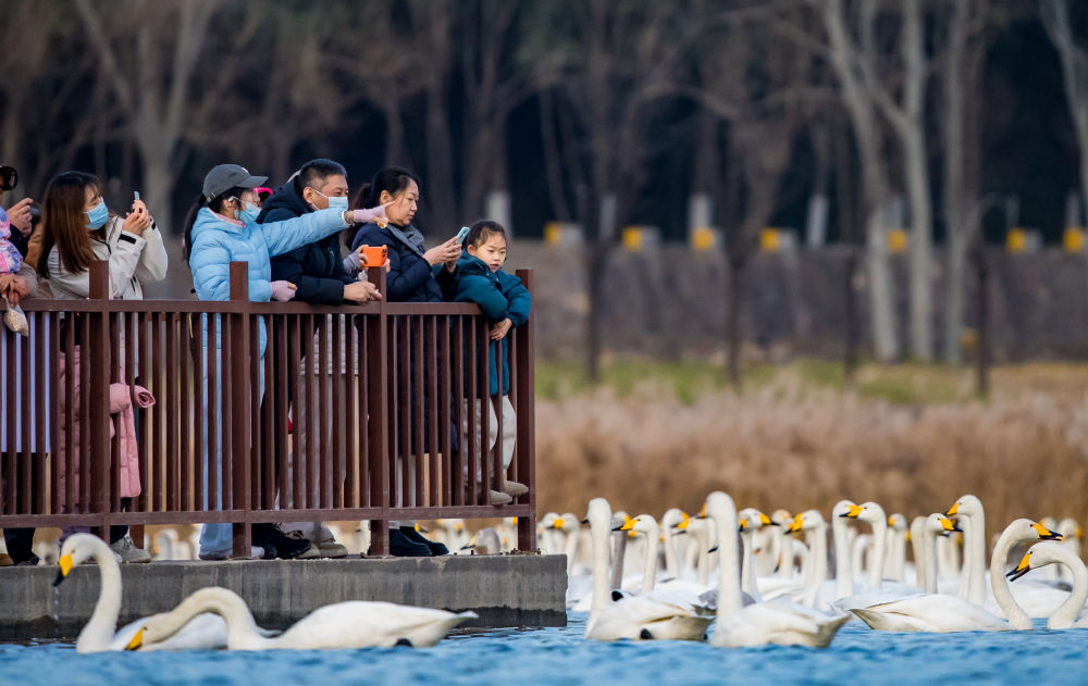 ↑12月20日,游人在河南省三門峽市天鵝湖國家城市濕地公園觀賞天鵝。新華社發(牛書培攝)