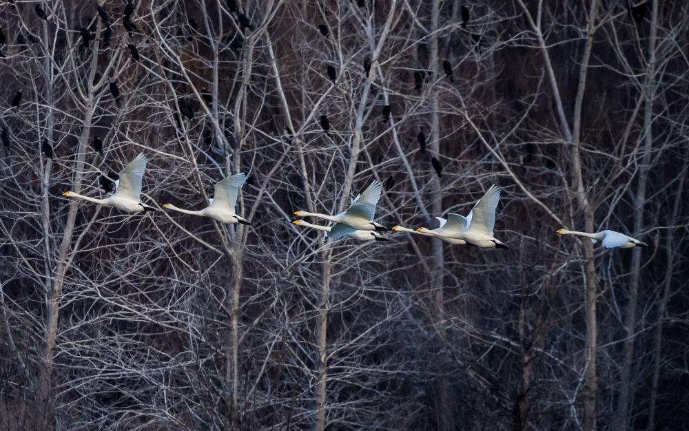 ↑12月20日在河南省三門峽市天鵝湖國家城市濕地公園拍攝的白天鵝。新華社發(趙永濤攝)