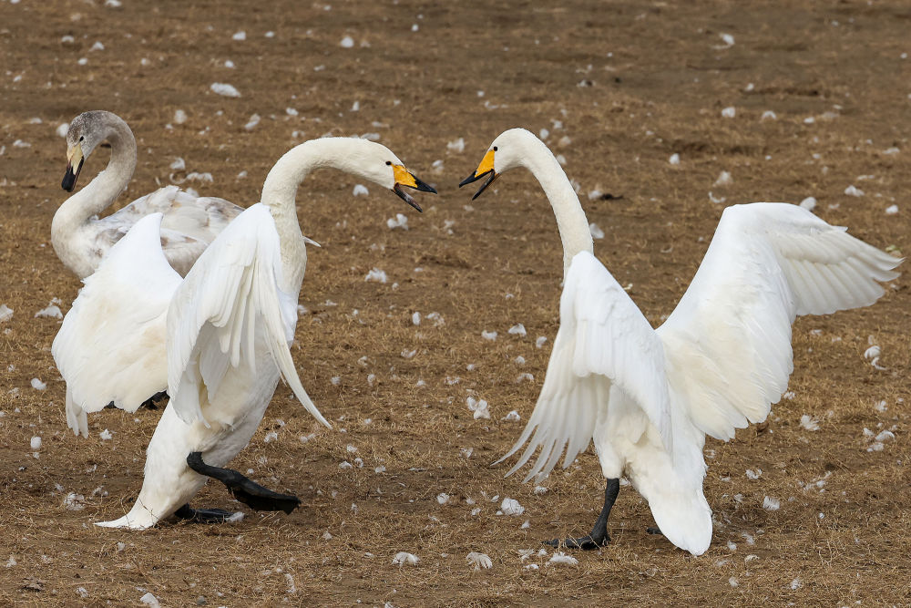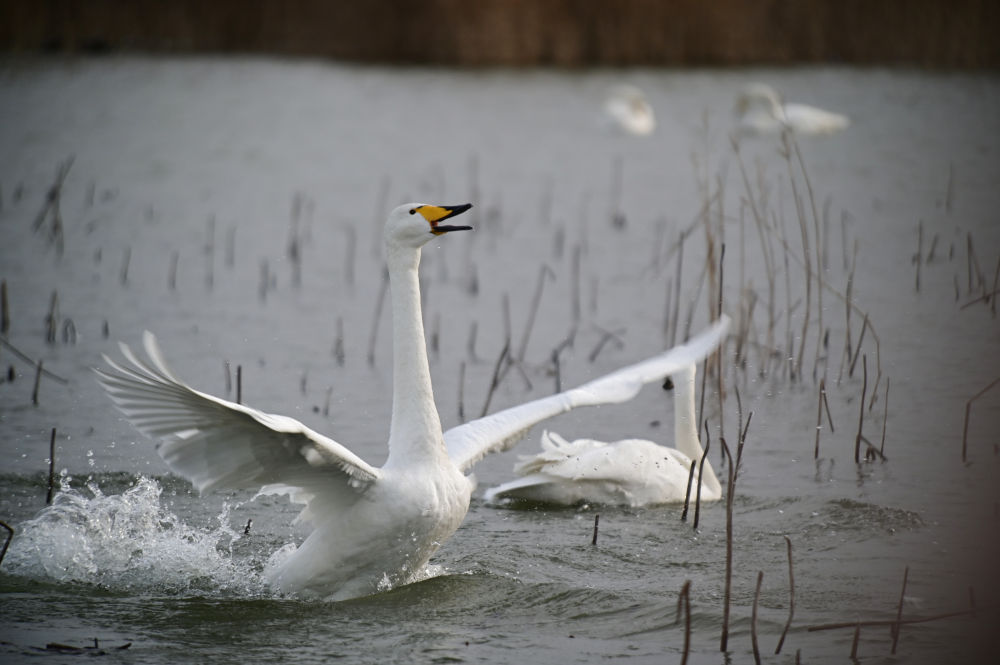 ↑12月21日在河南省三門峽市黃河濕地拍攝的白天鵝。新華社發(段二平攝)