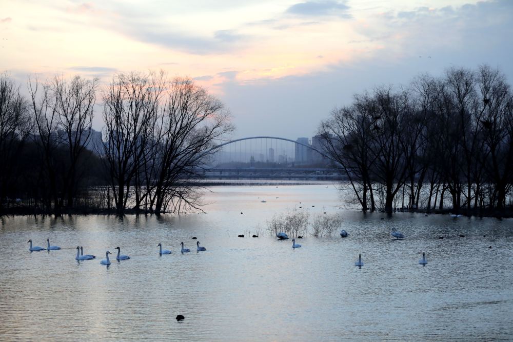 ↑12月20日在河南省三門峽市天鵝湖國家城市濕地公園拍攝的白天鵝。新華社發(馮小敏攝)