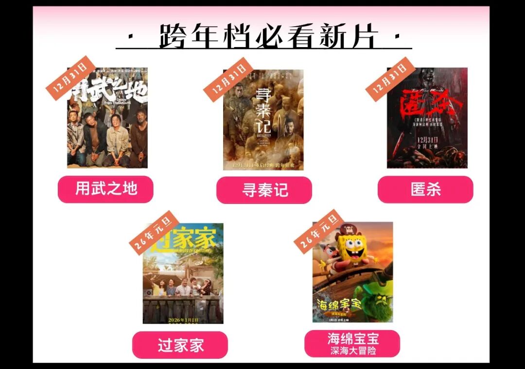 此外,《尋秦記》《用武之地》《匿殺》《過家家》《他年她日》《海綿寶寶:深海大冒險》等多部題材多元、陣容強勁的佳作將齊聚跨年檔,覆蓋情懷、現實、懸疑、愛情、家庭、動畫等多重賽道,滿足不同觀眾的觀影需求。