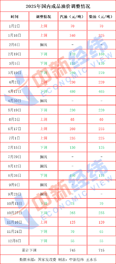 2025年全年成品油零售調(diào)價一共經(jīng)歷25輪調(diào)價窗口期,其中累計7次上調(diào),12次下調(diào),6輪擱淺。卓創(chuàng)資訊高級分析師孟鵬表示:“標(biāo)準(zhǔn)汽油累計下調(diào)915元/噸,標(biāo)準(zhǔn)柴油累計下調(diào)880元/噸,折算升價92號汽油、95號汽油及0號柴油分別累計下調(diào)0.72元、0.76元及0.75元。”