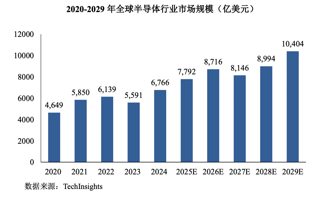 隨著人工智能、物聯網、汽車電子、消費電子、云計算等多個應用領域的市場增量需求,半導體行業迎來蓬勃發展。根據TechInsights統計,2024年全球半導體市場規模提升至6,766億美元,同比增長21.02%。預計2029年全球半導體行業市場規模將進一步增長至10,404億美元,2024-2029年均復合增長率為8.99%。
