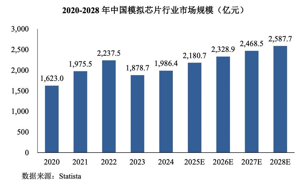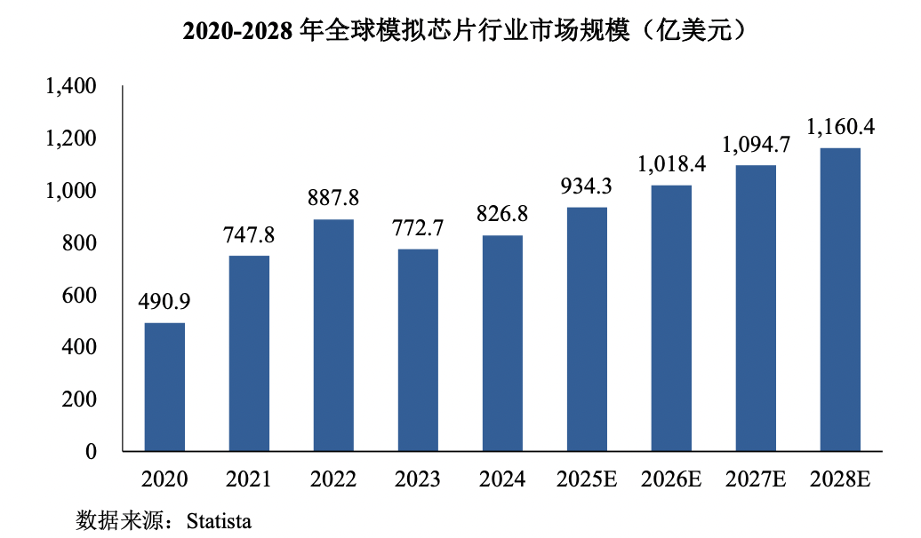 另外,根據Statista統計,2024年全球模擬芯片行業市場規模為826.8億美元,同比增長7.00%,預計2028年全球模擬芯片行業市場規模將達1,160.4億美元,2024-2028年均復合增長率為8.84%。