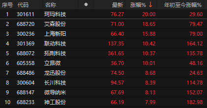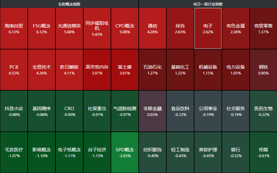 分行業來看,通信、綜合、電子、有色金屬、商貿零售等行業領漲,傳媒、銀行、美容護理等行業領跌。