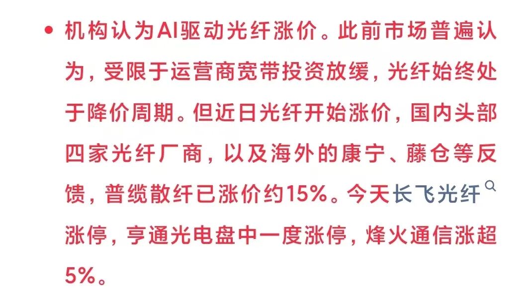 上周提示大家,光纖開始走漲價反轉邏輯,特別是出口海外數據中心的,今天光纖板塊再度暴漲,長飛光纖、亨通光電漲停,中天科技漲超7%。