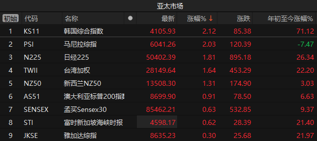 今天亞太股市也是全線上漲,韓國綜合指數漲超2%,日經225漲幅為1.81%,中國臺灣加權指數漲幅為1.61%,A股高開高走,創業板指、科創50均漲超2%。