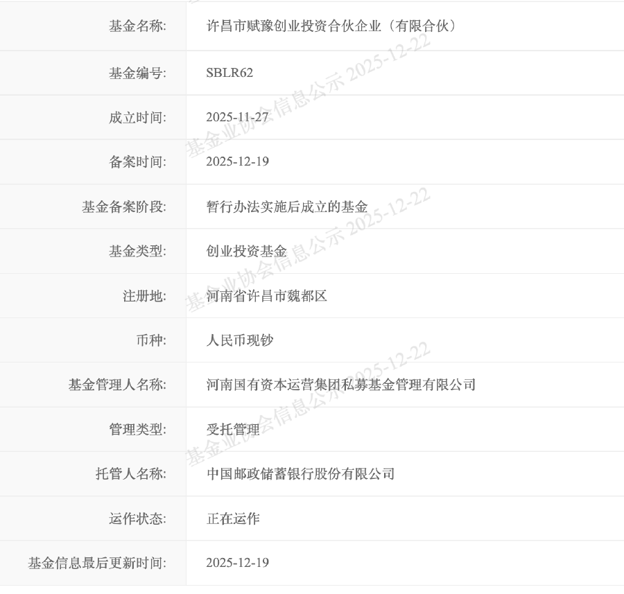 【大河財立方消息】12月19日,許昌市賦豫創業投資合伙企業(有限合伙)(以下簡稱“賦豫基金”或“基金”)在中國證券投資基金業協會備案,中原電氣谷產業基金集群正式開始運作。