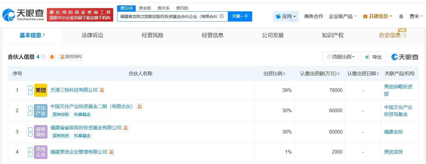 天眼查App顯示,近日,福建省龍珠文旅數(shù)創(chuàng)股權(quán)投資基金合伙企業(yè)(有限合伙)成立,執(zhí)行事務(wù)合伙人為福建美珠企業(yè)管理有限公司,出資額20億人民幣,經(jīng)營范圍為以私募基金從事股權(quán)投資、投資管理、資產(chǎn)管理等活動(dòng),由美團(tuán)旗下天津三快科技有限公司、中國文化產(chǎn)業(yè)投資基金二期(有限合伙)、福建省省級政府投資基金有限公司、福建美珠企業(yè)管理有限公司共同出資。