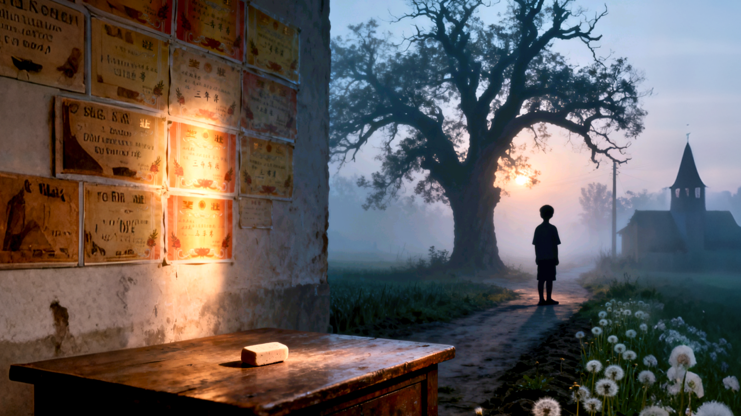 薄霧漫過(guò),老槐樹(shù)的影子在晨曦中愈發(fā)嶙峋。村口那站成剪影的孩子,是這片土地上最固執(zhí)的守望。